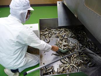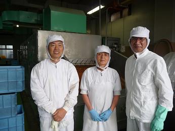 上の三人は、井口食品の本社工場で、出汁やふりかけなどを作っている体力満点の製造者です。三人の後ろの機械は、遠赤外線の乾燥機です。名島屋の出汁に入っている、うるめいわしなど、仕入れたものを、もう一度熱を通しているので、魚のうまみだけ残り、おいしくなっているのです。この機械が動いているときは、工場内の温度は相当高くなり、夏は大変な重労働です。