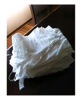 ところで、下の写真は、くたばってしまったシーツを、20センチ近くの正方形に、はさみで切ったものです。これが、大変役にたつのです。たとえば、油を使ったフライパン、ちょっと残した皿のおかず、鍋のまわりについたカレールー、なんでもかんでも、洗う前に皿やお鍋の残り物を取り払うのです。それから洗うと、洗剤も少なくてすむし、排水が余計に汚れないのです。洗うのもずいぶん楽ですよ。