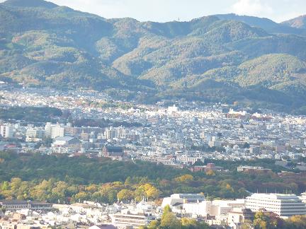 この紅葉の写真は、青蓮院門跡 別院 大日堂の園内の紅葉です。ここには将軍塚というものがあります。恒武天皇が都を奈良から京都の長岡に移され、天皇は、京都盆地は三方が山に囲まれ、帯のように河も流れて自然に城のような地形をしているから山背の国を山城の国を定め、都は平安京と呼べと申されたそうです。また、長くこの都を護るようにと祈りをこめて、高さ2.5メートル程の将軍像を土で作り、これに、鎧甲を着せ鉄の弓矢を持たせ、太刀を帯させここに埋めるように命じられた。この塚を将軍塚といわれています。この塚のほとりから目の下に京の街を眺める時に、向こうは愛宕山、真ん中あたりの緑地は、京都御所、左向こうは大坂です。